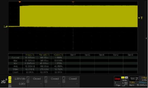 為了確定具體的問題,使用ZDS4000系列示波器采樣電機啟動后的PWM波形,設置為單次上升沿觸發,采樣時間大概為7秒,波形如圖4所示,由于采樣的時間長,波形多,完全是密密麻麻,什么細節都看不到,開啟測量和統計功能,可以看到信號周期、頻率、占空比Current、Max、Min和相關計算值,但是還是找不到異常的占空比波形。