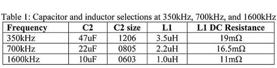 表格1:頻率分別為350kHz, 700kHz,和1600 kHz時的電容器和感應器選項 |