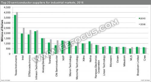 在預(yù)測2017年經(jīng)濟狀況繼續(xù)改善的同時,IHS Markit列出了以市場份額排名的工業(yè)半導(dǎo)體市場前20強。