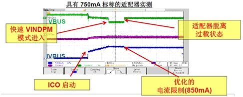 其次,能夠實現97%的效率得益于TI獨特的ICO算法,ICO能夠實時檢測適配器的電流能力大小。文司華博士做了詳細解釋,“如上圖所示,這是我們的VBus,當接入電池后發生了一些變化。接入電池后就開始充電了,作為ICO模式,作為比較小的電流去測,比如500毫安開始啟動了,在500毫安時適配器很舒服地進行工作,當電流逐漸上調了以后,我們會發現Bus電壓突然掉下來了,它能掉下來并且保持在這個模式下,VEDPM模式啟動了,在這個模式里,適配器實際上已經過載了,由于VEDPM功能的保護,適配器雖然過載但還能工作,因此這個點能夠保持,但這不是最理想的狀況,原因是它讓適配器過載了,適配器會發燙的,最好的處理辦法是讓適配器能夠脫離這個狀態,ICO功能能夠讓電流再退回一點,等它退回一點,這個適配器就脫離過載狀態了。”