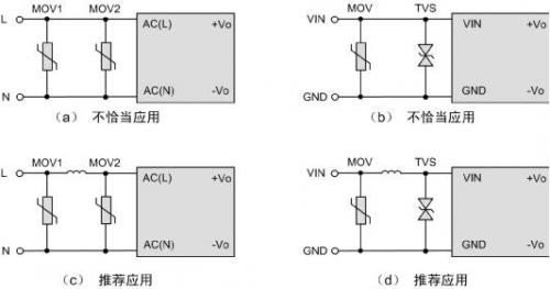 電源模塊體積小,在EMC要求比較高的場合,需要增加額外的浪涌防護電路,以提升系統EMC性能。如圖1所示,為提高輸入級的浪涌防護能力,在外圍增加了壓敏電阻和TVS管。但圖中的電路(a)、(b)原目的是想實現兩級防護,但可能適得其反。如果(a)中MOV2的壓敏電壓和通流能力比MOV1低,在強干擾場合,MOV2可能無法承受浪涌沖擊而提前損壞,導致整個系統癱瘓。同樣的,電路(b),由于TVS響應速度比MOV快,往往是MOV未起作用,而TVS過早損壞。