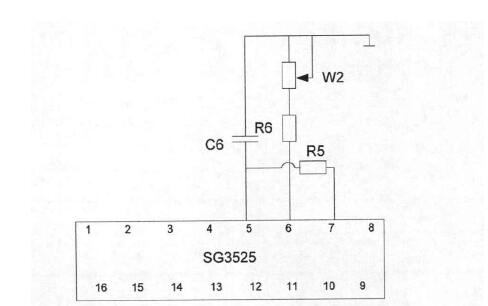 本文設計的模塊控制與驅動模塊,工作頻率是由芯片的腳、腳和腳外接的電阻與電容來確定。如圖所示,其中電阻和滑動變阻器組成,電容即為,為。根據(jù)計算公式可以知道